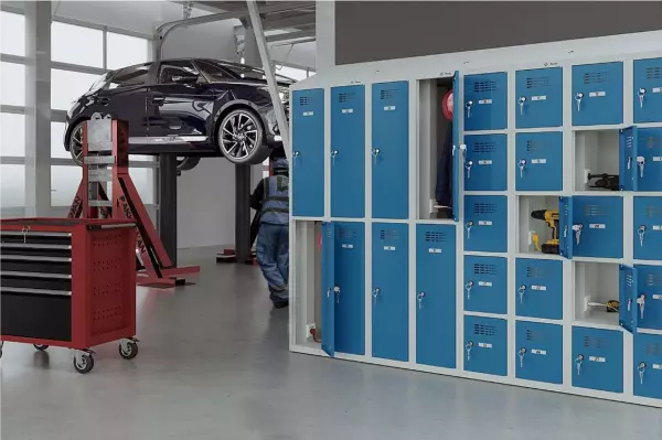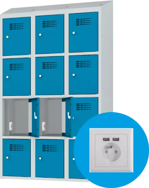 La gama de muebles de acero EBMSUv está equipada con enchufes y dos puertos USB adicionales para dispositivos eléctricos y electrónicos. Los armarios encajan perfectamente como parte del equipamiento de escuelas, bibliotecas, clubes deportivos o gimnasios.