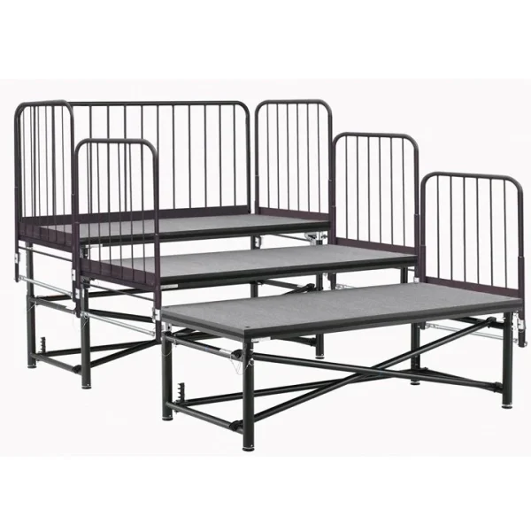 - Las barandas soldadas de acero tienen rieles y retenes para sillas en su parte superior, media e inferior, acabados con revestimiento de barniz granulado negro. También está disponibles con revestimiento de zinc para aplicaciones de exterior