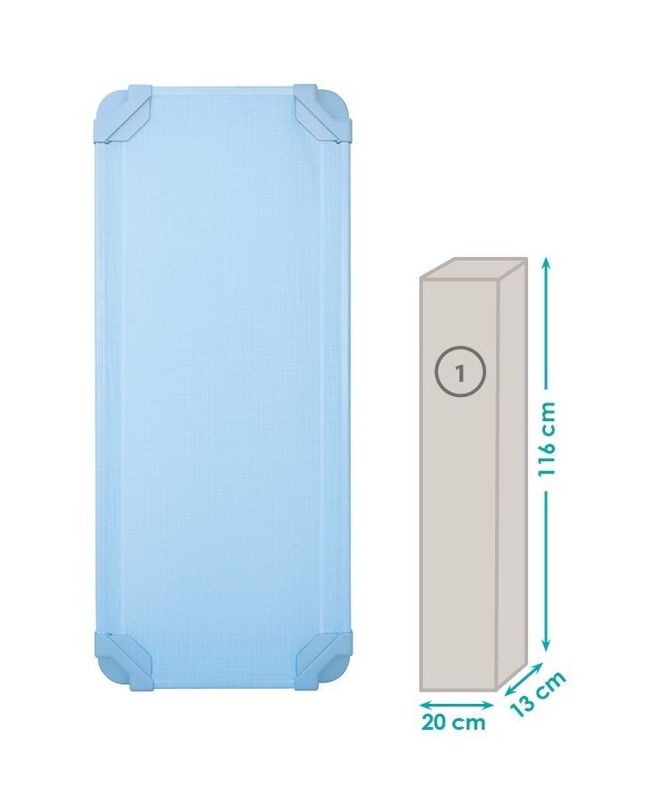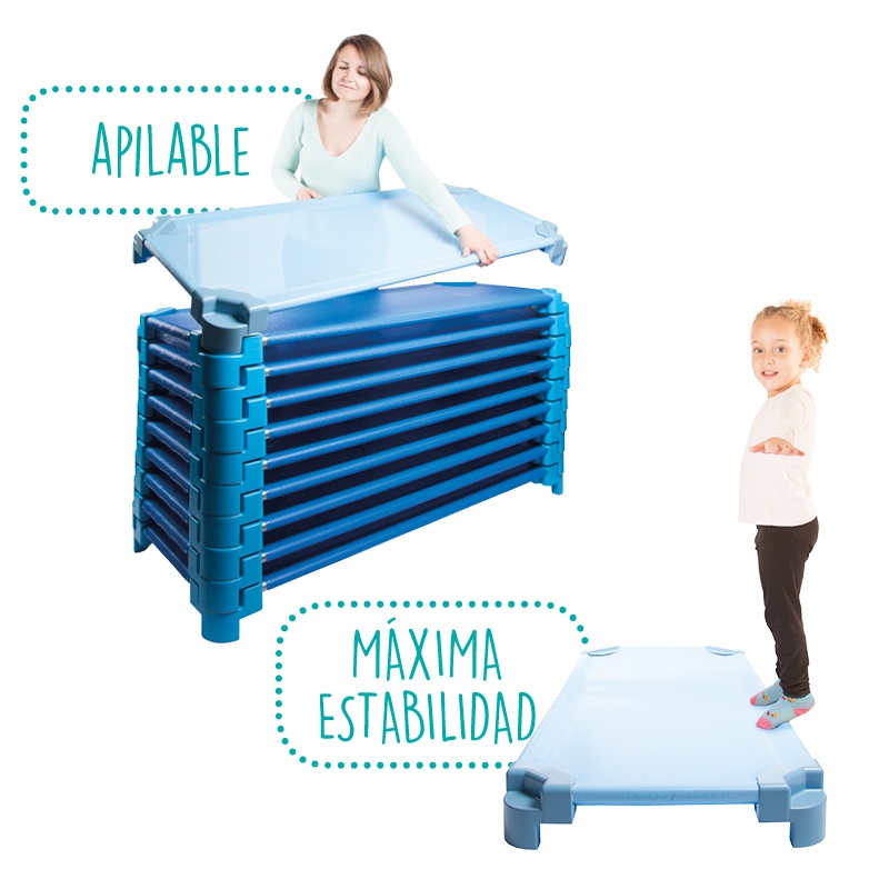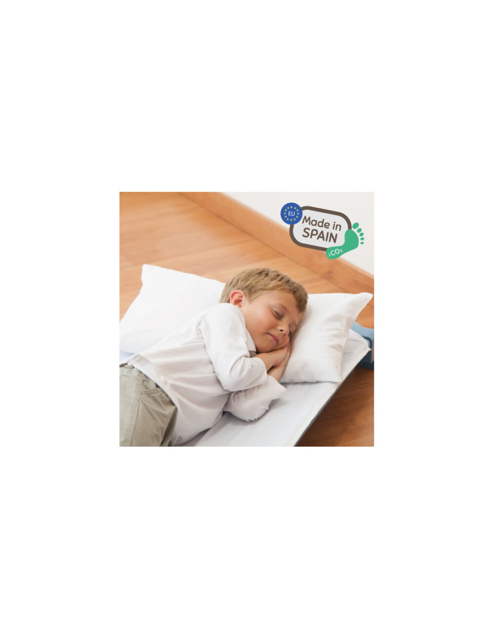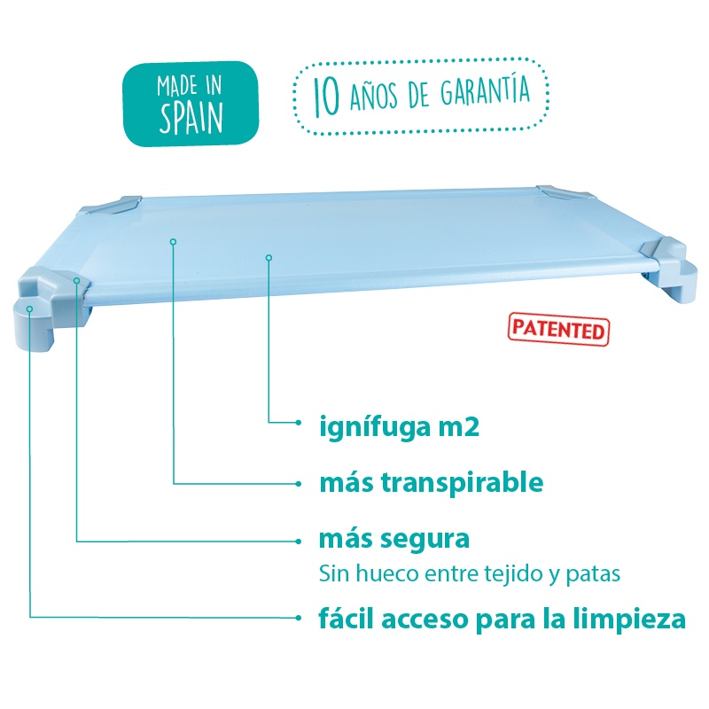 La cama más segura del mercado, fabricada en España conforme a la Normativa Europea de Seguridad. Su gran estabilidad evita accidentes: no se vuelca. Su tela es ignífuga M2 y no se destensa con el uso. La robustez de sus patas evita accidentes al no dejar huecos entre tejido y patas, y permite su fácil higiene. (131x55x11cm).
