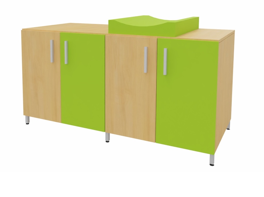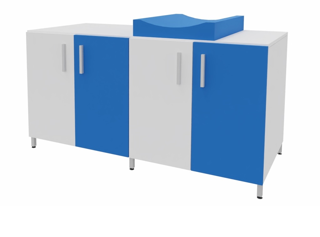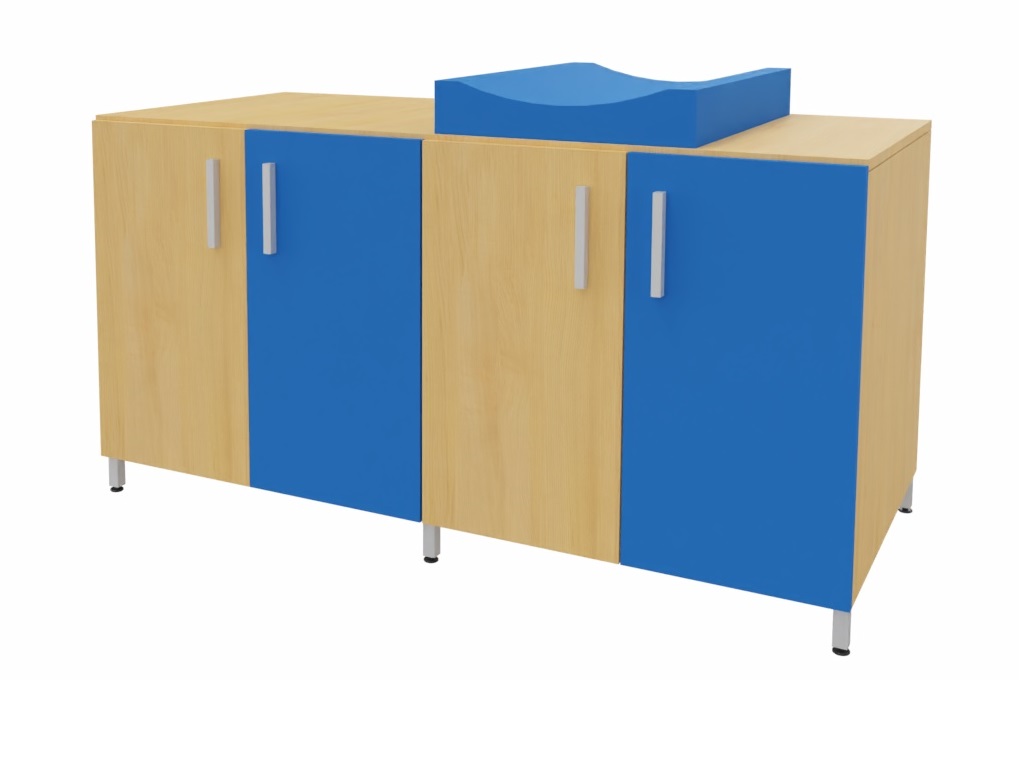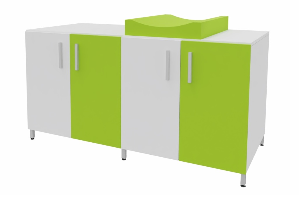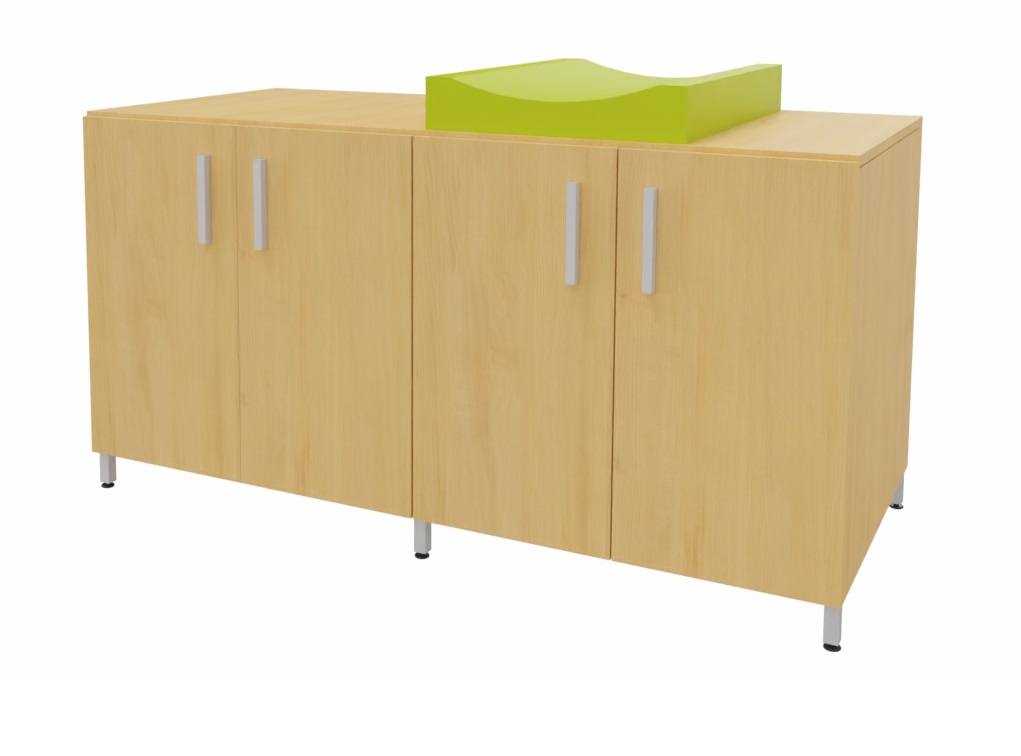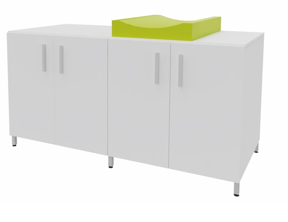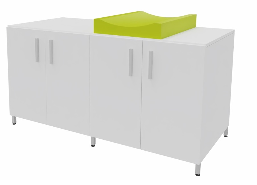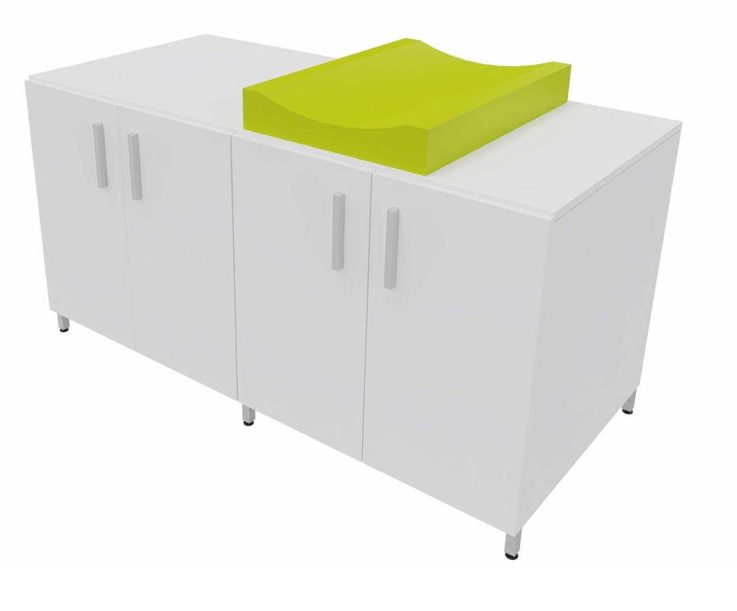 Cambiador con cuatro puertas para almacenar los pañales y productos de higiene de cada niño. El colchón de cambio curvo proporciona un doble uso, por un lado un práctico almacenaje de fácil acceso para los productos de higiene y por otro lado el lugar perfecto para realizar la higiene de los bebés. Facilita el cuidado diario de los bebés al permitir realizar el cambio de pañales sin tener que agacharse. Encimera en tablero fenólico, resistente a la humedad. Posibilidad de incorporar diferentes modelos de bañeras y fregaderos. Patas de aluminio para facilitar la limpieza. Se fabrica a medida para adaptarse a cada aseo.