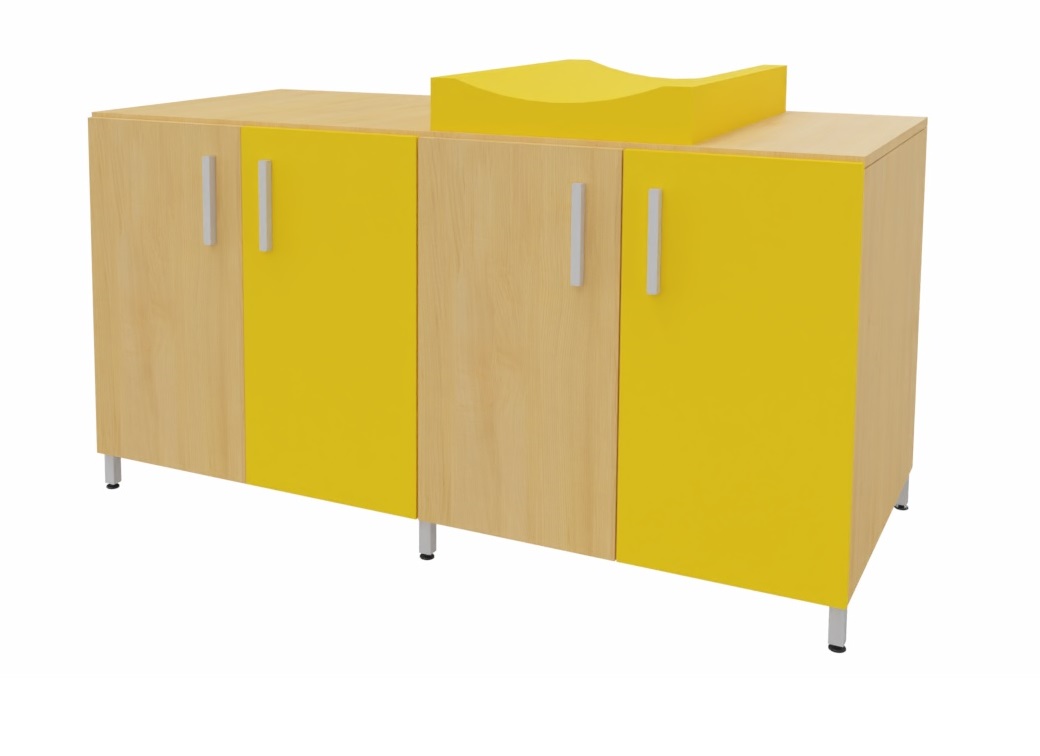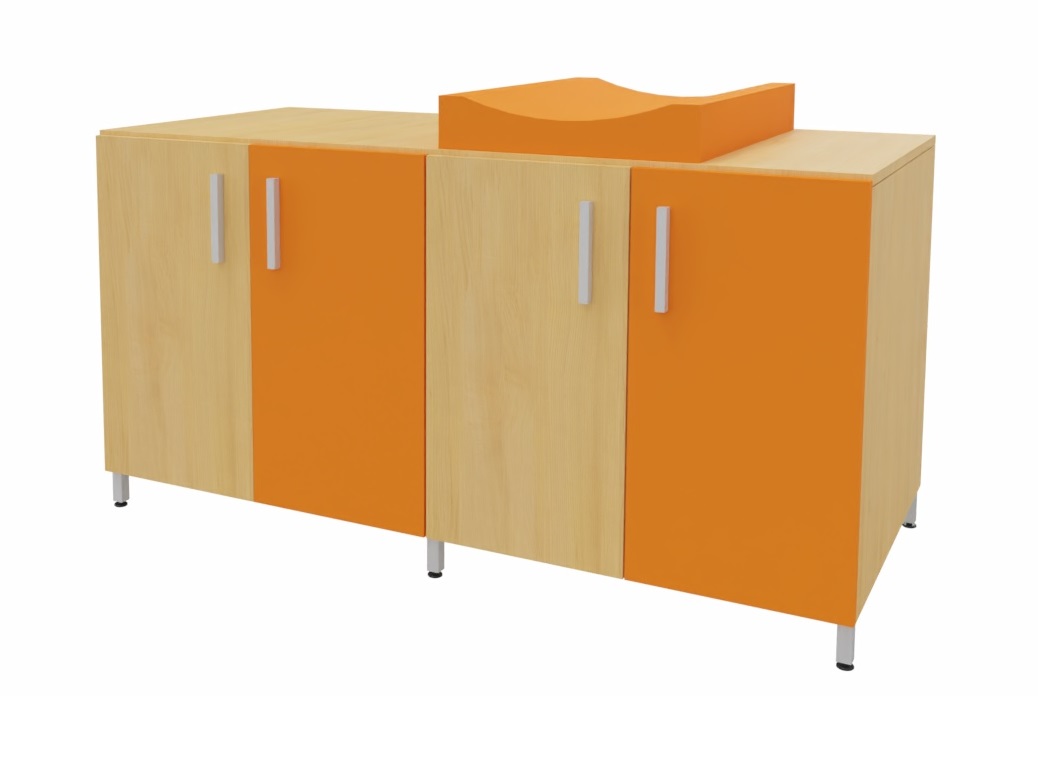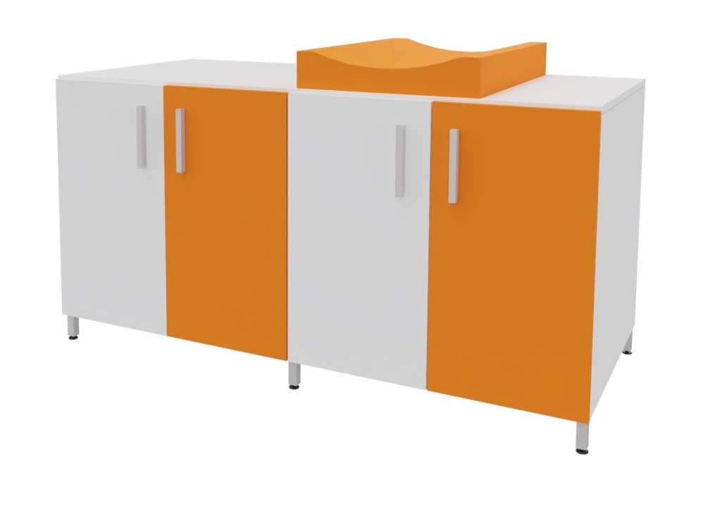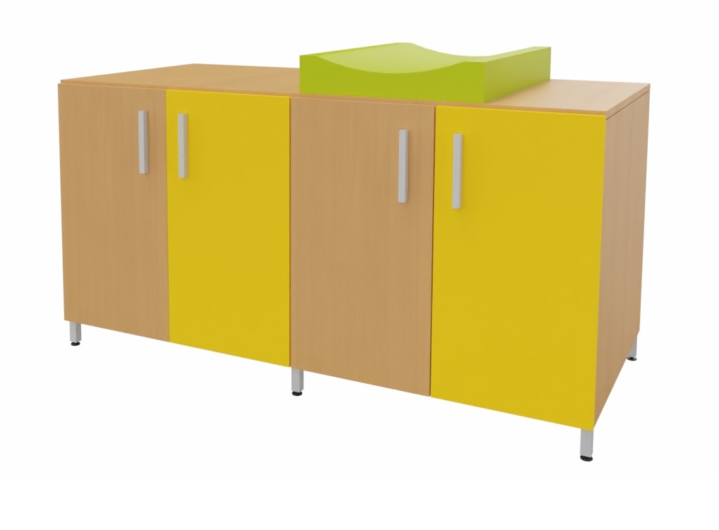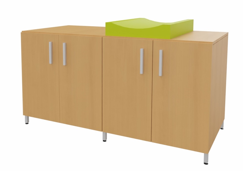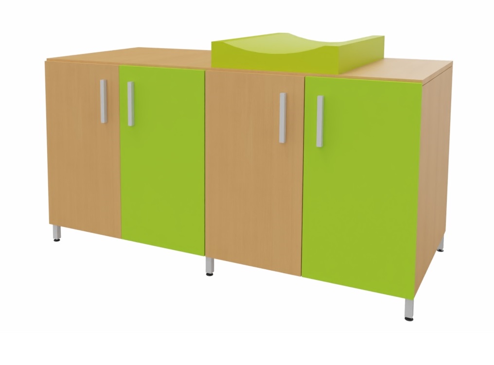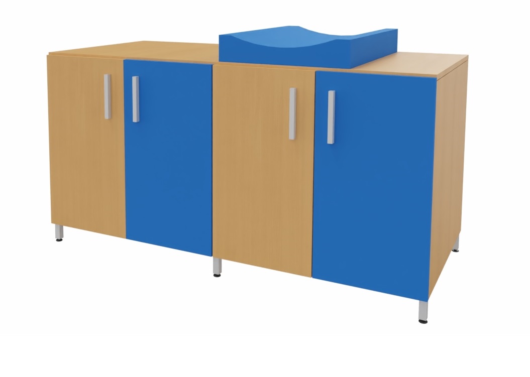 Cambiador con cuatro puertas para almacenar los pañales y productos de higiene de cada niño. El colchón de cambio curvo proporciona un doble uso, por un lado un práctico almacenaje de fácil acceso para los productos de higiene y por otro lado el lugar perfecto para realizar la higiene de los bebés. Facilita el cuidado diario de los bebés al permitir realizar el cambio de pañales sin tener que agacharse. Encimera en tablero fenólico, resistente a la humedad. Posibilidad de incorporar diferentes modelos de bañeras y fregaderos. Patas de aluminio para facilitar la limpieza. Se fabrica a medida para adaptarse a cada aseo.