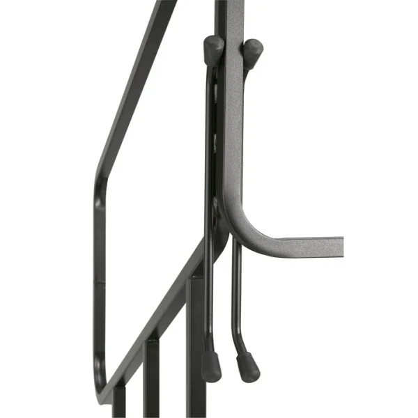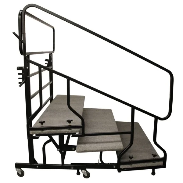 Todas las tarimas Choral vienen con un riel posterior incorporado para mayor seguridad, sin costo adicional. Este componente fundamental también se pliega sobre la unidad para mantener los escalones seguros en la posición de transporte. También recomendamos nuestro nuevo sistema de rieles laterales para mayor seguridad y tranquilidad.
