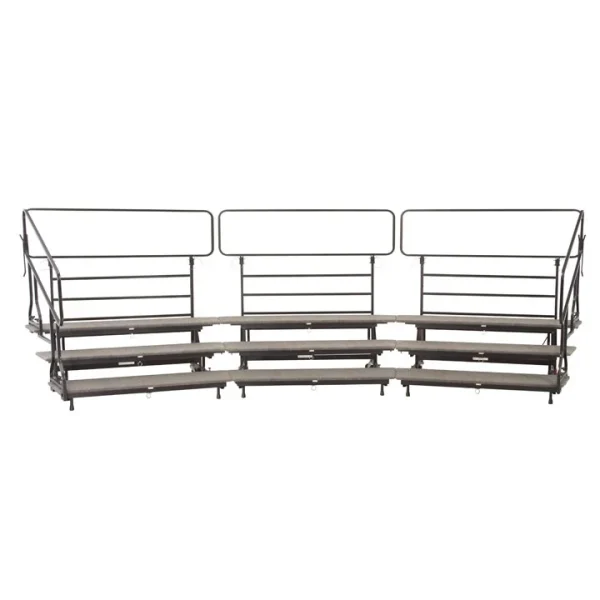 Estas innovadoras tarimas tienen un sistema rápido de escalones reversibles que facilita cambiar la configuración de las tarimas desde la tradicional disposición semicircular a combinaciones rectas u más creativas, ¡sin herramientas! Utilice esta función para crear configuraciones originales para conciertos de coros o conciertos de doble coro.