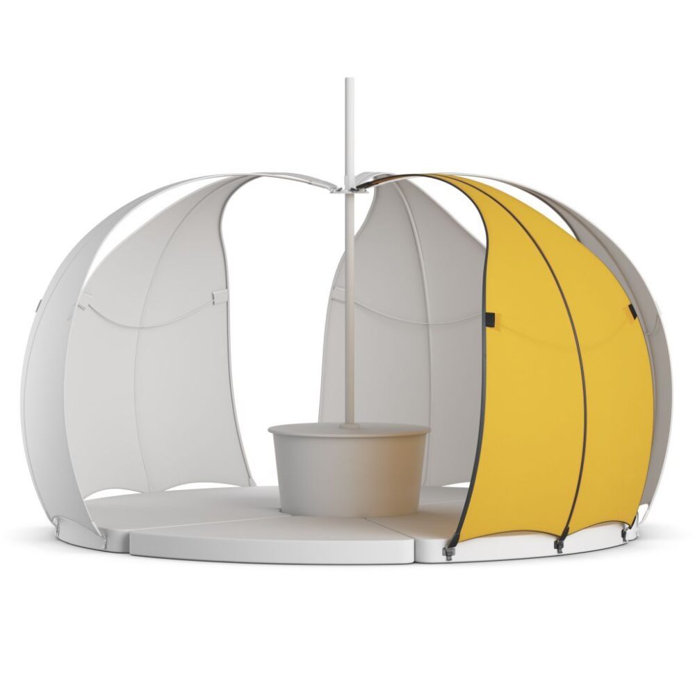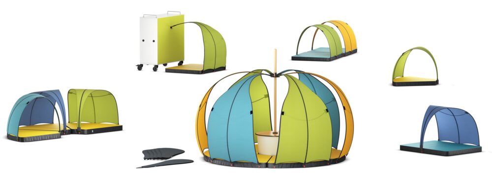 Elementos de carpa para crear zonas de descanso individuales en el aula para niños o grupos pequeños. Los elementos triangulares de material se pueden combinar con las esterillas de la serie Shift+ para crear configuraciones de carpa y rincones. Asimismo, los elementos textiles tipo vela se pueden fijar a cualquier superficie magnética (armarios de la serie Shift+) mediante fijaciones magnéticas. Un poste de carpa, que también se puede utilizar en combinación con el elemento de almacenamiento Gugl y/o las esterillas triangulares Shift+-Landscape, permite construir una carpa redonda con un máximo de 6 elementos de vela.