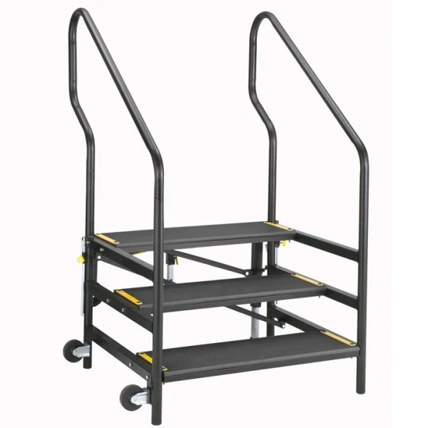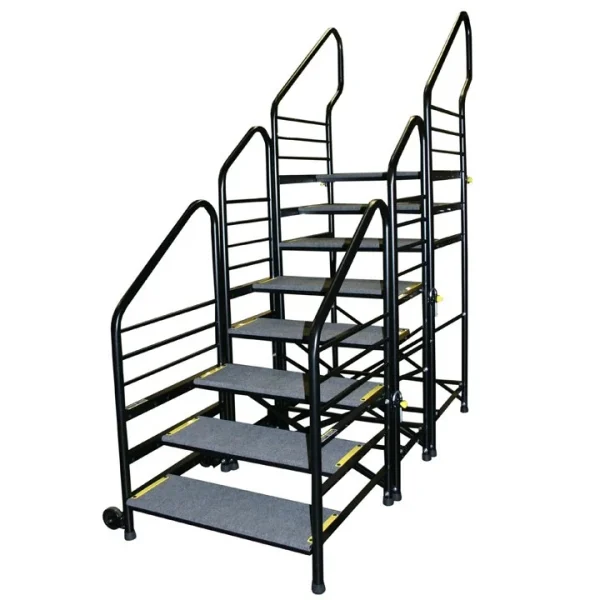 Los escalones para escenarios articulados o modulares están disponibles en múltiples configuraciones de escalones. Cada plataforma de escalones rueda y se bloquea en su lugar con facilidad. Los escalones están disponibles con peldaños de alfombra o de vinilo negro.