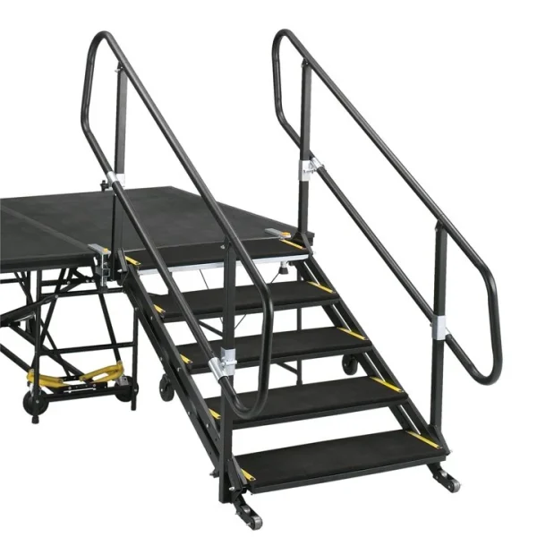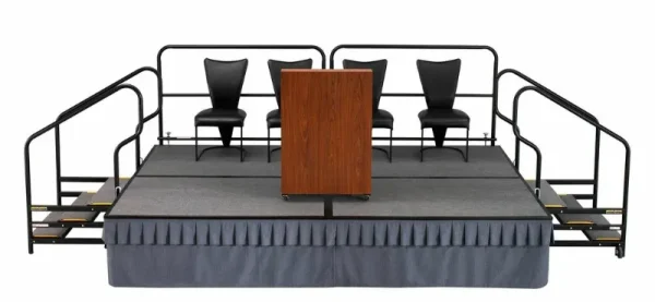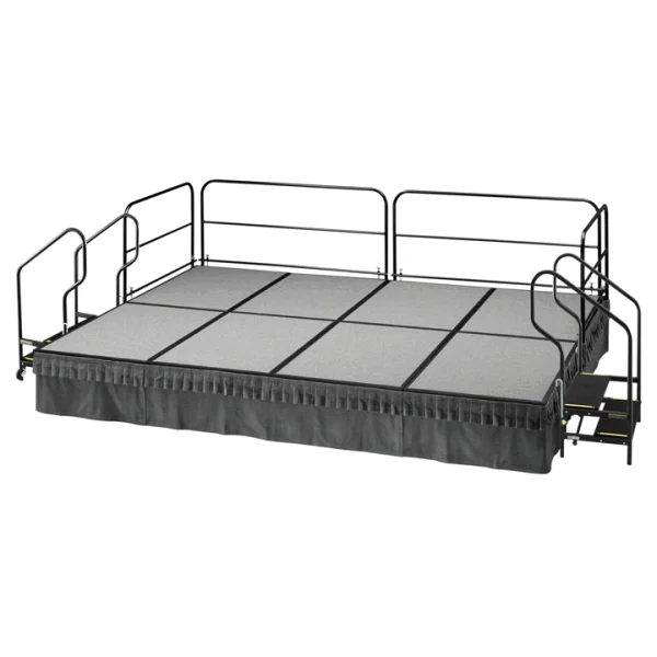 Ofrecemos todo lo necesario para configurar un escenario completo y seguro: telones de fondo, escalones, faldones decorativos, secciones de esquinas, barandas de protección, retenes para sillas y mesas, y carritos para transportar los accesorios. Pensando en la seguridad, recomendamos encarecidamente el uso de barandas de protección en todos los sistemas de escenarios y tarimas.