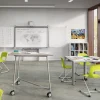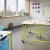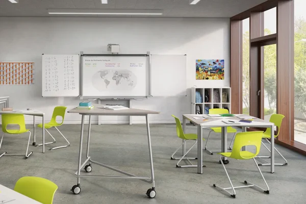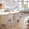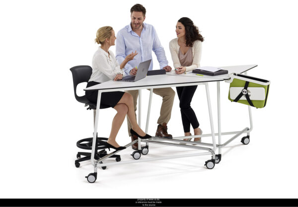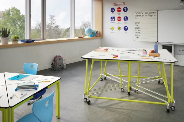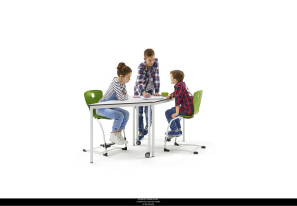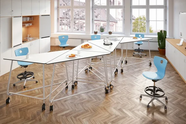 Los niños se sienten cómodos en la TriUnion de 106cm de altura; los adultos pueden unirse fácilmente a ellos utilizando una silla regulable en altura o un Hokki. La forma triangular demuestra ser particularmente favorable para el trabajo en equipo o por proyectos. Se pueden juntar varias mesas para grupos más grandes.