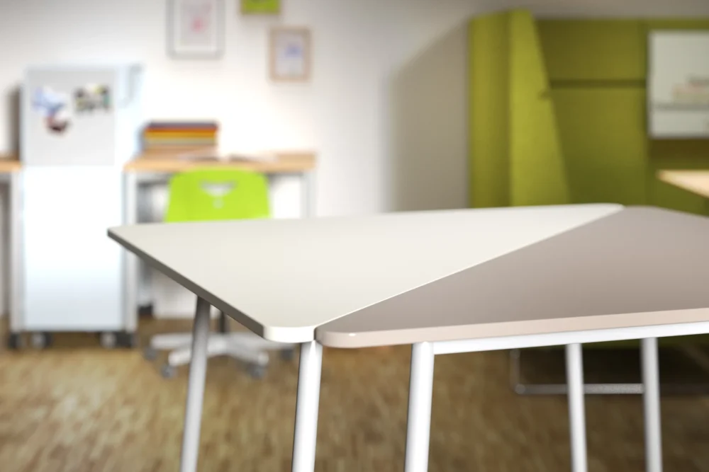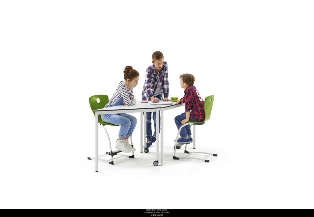 Los niños se sienten cómodos en la TriUnion de 120cm de altura; los adultos pueden unirse fácilmente a ellos utilizando una silla regulable en altura o un Hokki. La forma triangular demuestra ser particularmente favorable para el trabajo en equipo o por proyectos. Se pueden juntar varias mesas para grupos más grandes.