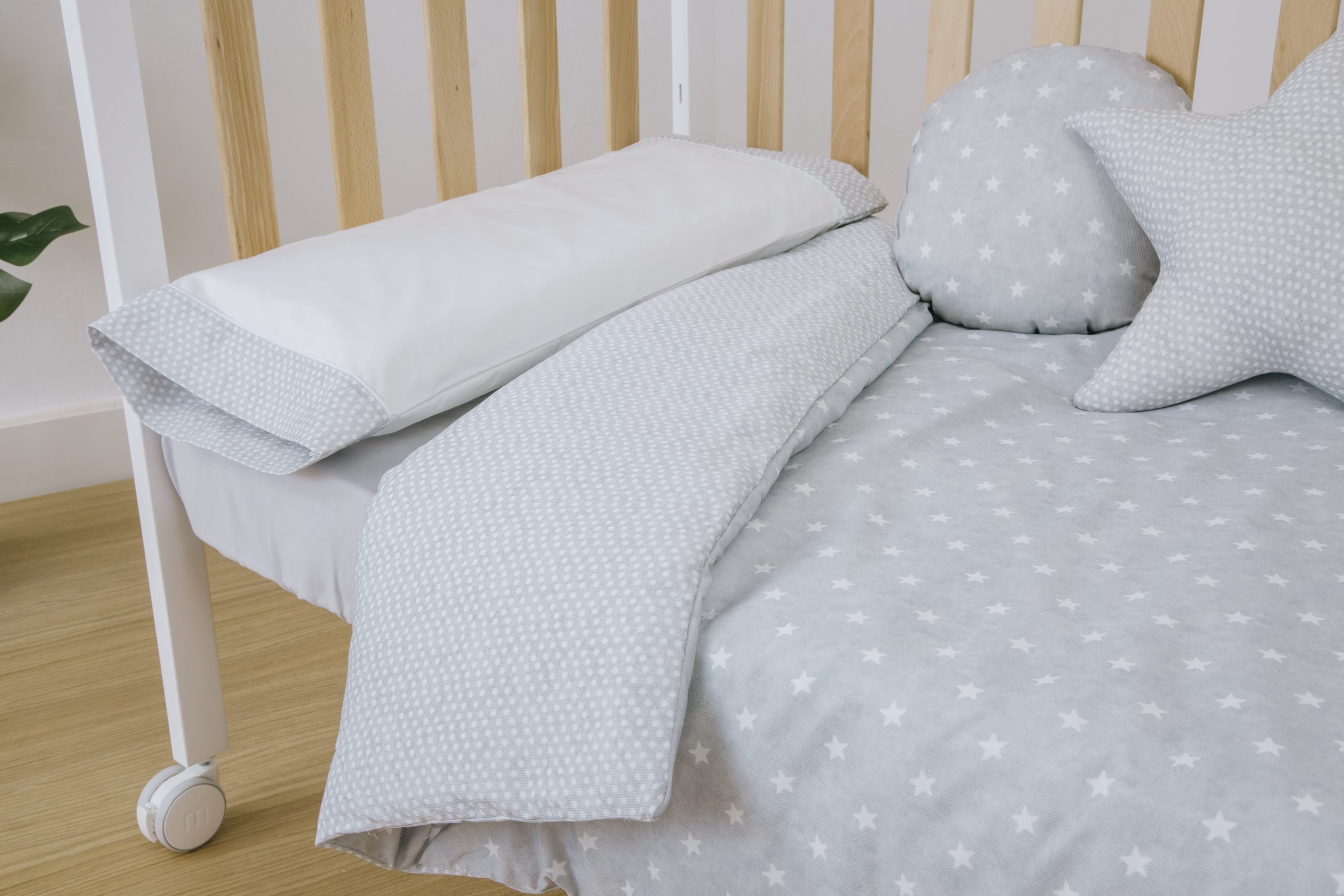 El nórdico es reversible, una parte con estampado de estrellas y la otra con unos pequeños topos que aportan elegancia al textil. Combínalo como más te guste. El protector es de dos piezas con topitos y rodea todo el interior de la cuna para proteger al bebé de los impactos.