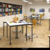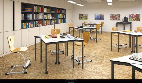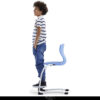 Silla Level-Lupo, la misma silla para todos. Utilizando un ingenioso mecanismo de desbloqueo por clic, los estudiantes pueden mover fácilmente el reposapiés hacia arriba o hacia abajo para adaptarse a su propio tamaño físico. Esto les permite sentarse a la misma altura de la mesa estándar que los estudiantes mayores o más jóvenes por igual, mientras mantienen la posición correcta de rodilla a pie.