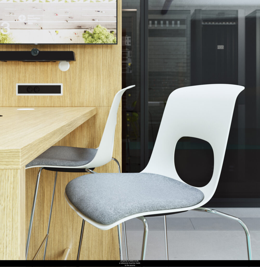 - Estructura de tubo de acero curvado, soldado y cromado (d= 12 mm). Opcionalmente disponible como silla con reposabrazos con soporte de plástico para