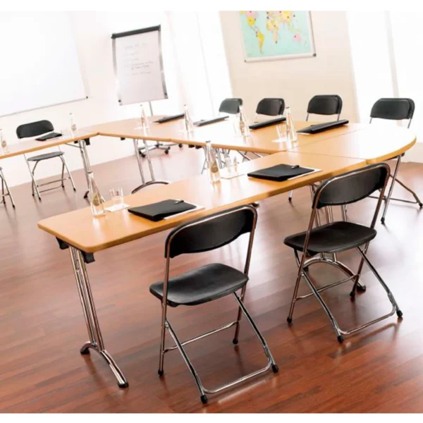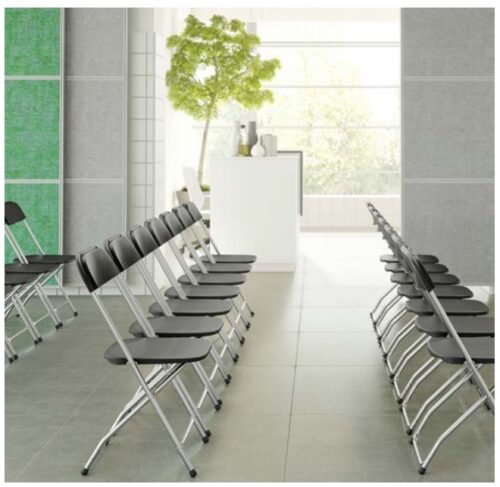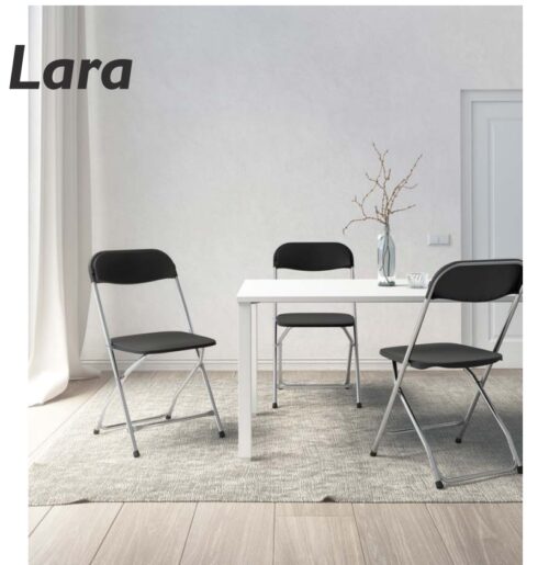 Silla Lara del fabricante nacional Mobel linea de cuatro pies plegables con estructura cromada sin brazos y asiento/respaldo en polipropileno negro anatómico y muy confortable. Pedido mínimo 6 unidades (y en múltiplos de 6). Ideal para formaciones, colectividades o como soporte para mesas de trabajo ocasionales, la silla Lara de Mobel Linea es una excelente opción si se busca una silla plegable para colectividades, de estilo contemporáneo y a un precio muy competitivo. CAJA 6 UDS