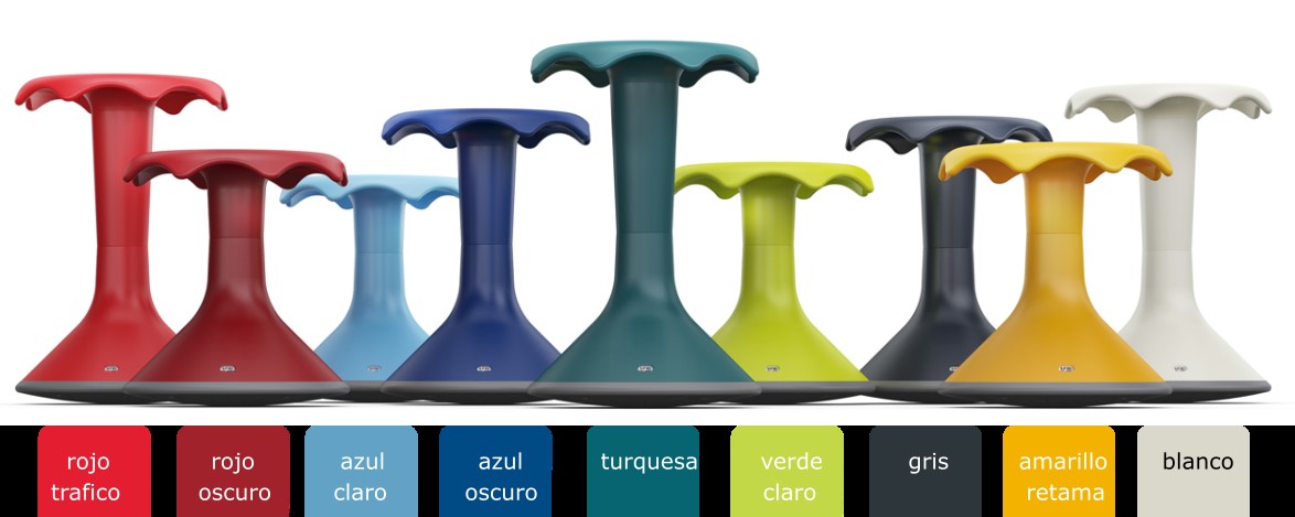 Función: ofrece libertad de movimiento en condiciones controladas gracias a superficies curvas que estimulan todo el sistema musculoesquelético. Fácil de transportar gracias al borde del asiento ondulado de forma ergonómica que es fácil de agarrar y también evita que el usuario se resbale. Los taburetes son fáciles de transportar y se pueden mover juntos para ahorrar espacio. Modelos de altura regulable con mecanismo de activación integral y suspensión de profundidad ergonómica.