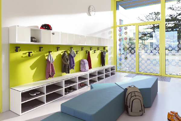 Soluciones prácticas para mantener el orden en el aula, con perchas y estantes diseñados para ofrecer organización y accesibilidad en el día a día.